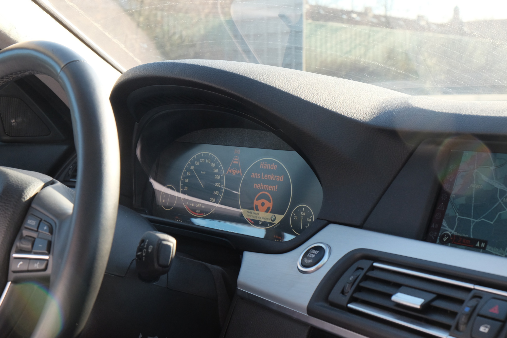 Erkennt das Auto im hochautomatisierten Betrieb, dass es mit der Situation nicht klar kommt, fordert es den Fahrer auf, das Steuer zu übernehmen. Der hat dann etwa 10 Sekunden, um zu reagieren, andernfalls hält das Fahrzeug an. In diesem Fall war die Grenze der hochpräzisen Karte erreicht, die der Testwagen benötigt. Vorher hatte bereits die tief stehende Sonne die Kamera geblendet, die die Fahrspur erfasst.