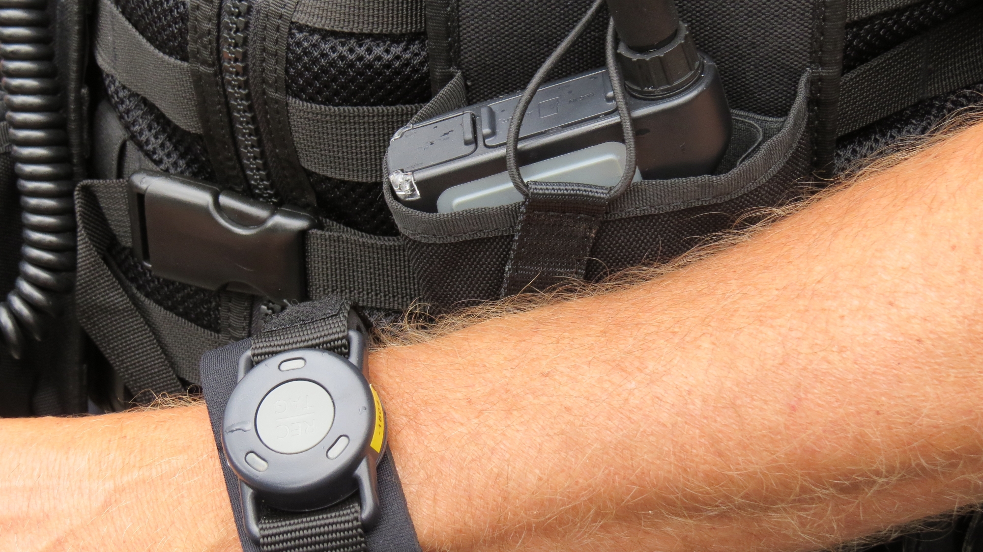 Über eine funkgestützte Bedieneinheit am Handgelenk kann der Bodycam-Träger Aufnahmen starten und beenden.