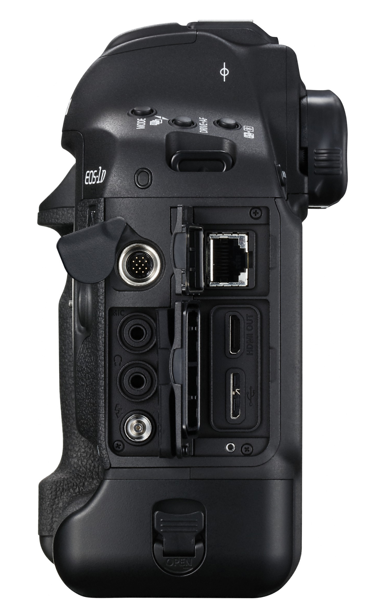 Neben LAN- und USB-3-Schnitstelle bietet die Canon EOS-1D X Mark II HDMI-Out, sowie Buchsen für Stereo-Mikrofon und -Kopfhörer. Unten links der Blitzsynchronanschluss und oben die Buchse für den WLAN-Adapter.