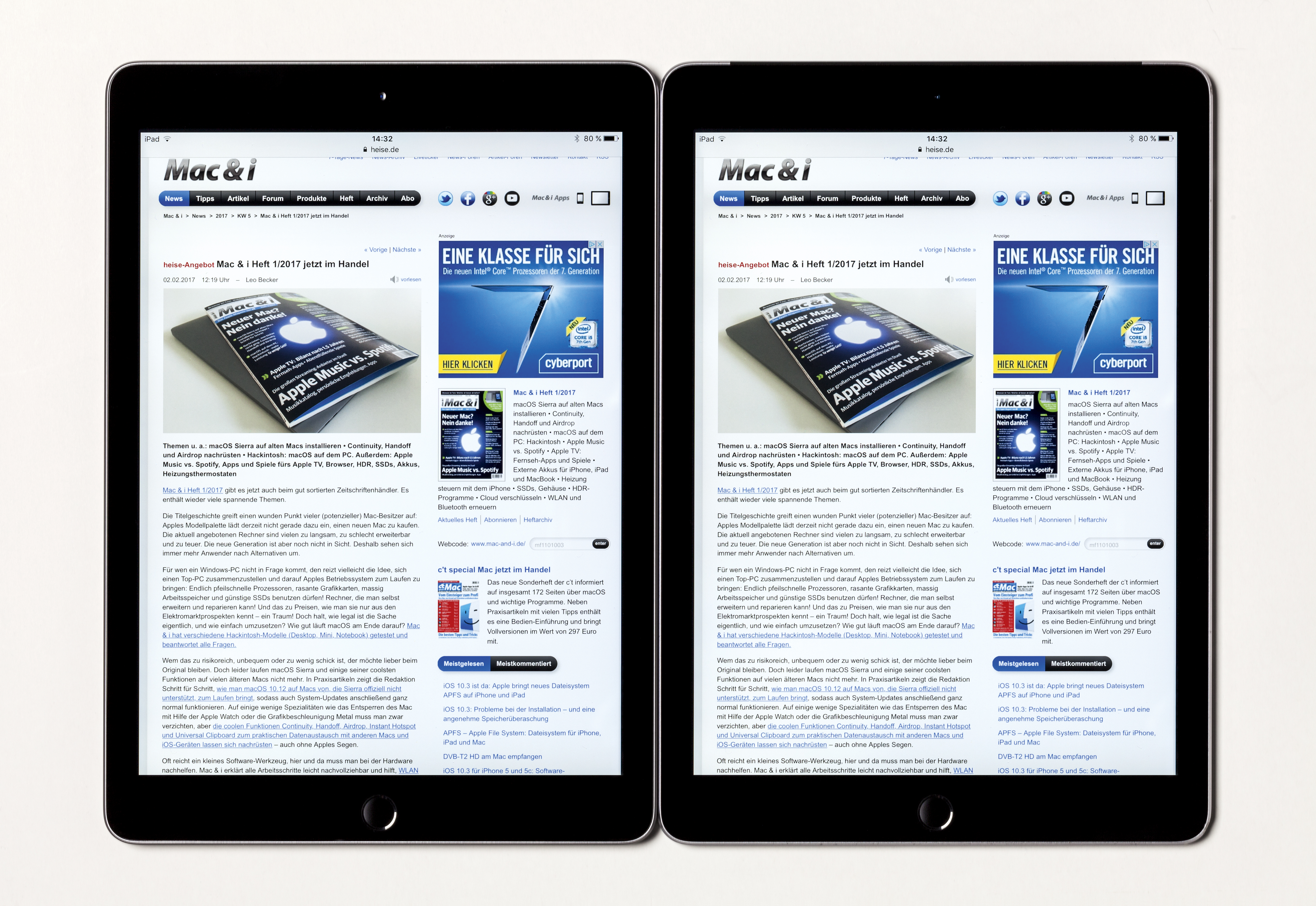 Von oben betrachtet fallen auch die Unterschiede zwischen iPad Air 2 (rechts, mit LTE) und dem iPad 5 nicht sonderlich auf.