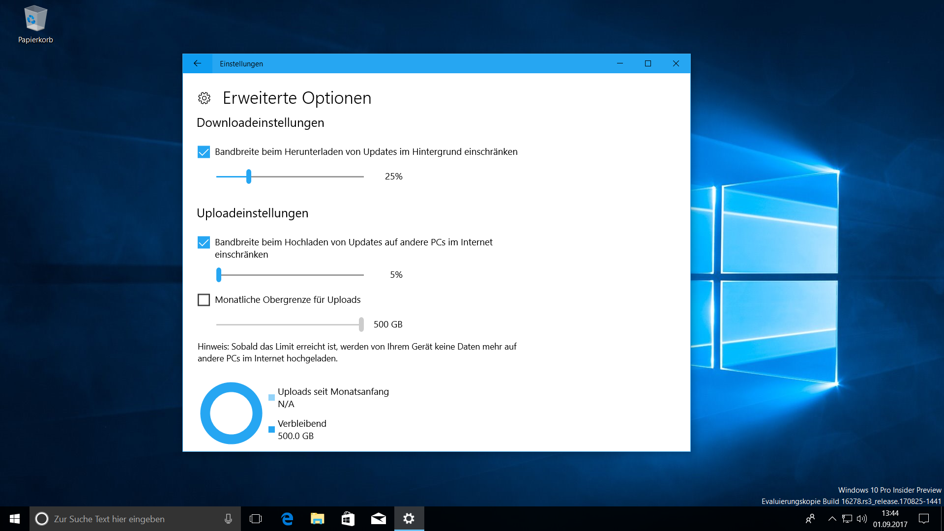 In den Windows-Update-Optionen lässt sich nun die Bandbreite für den Up- und Download begrenzen.