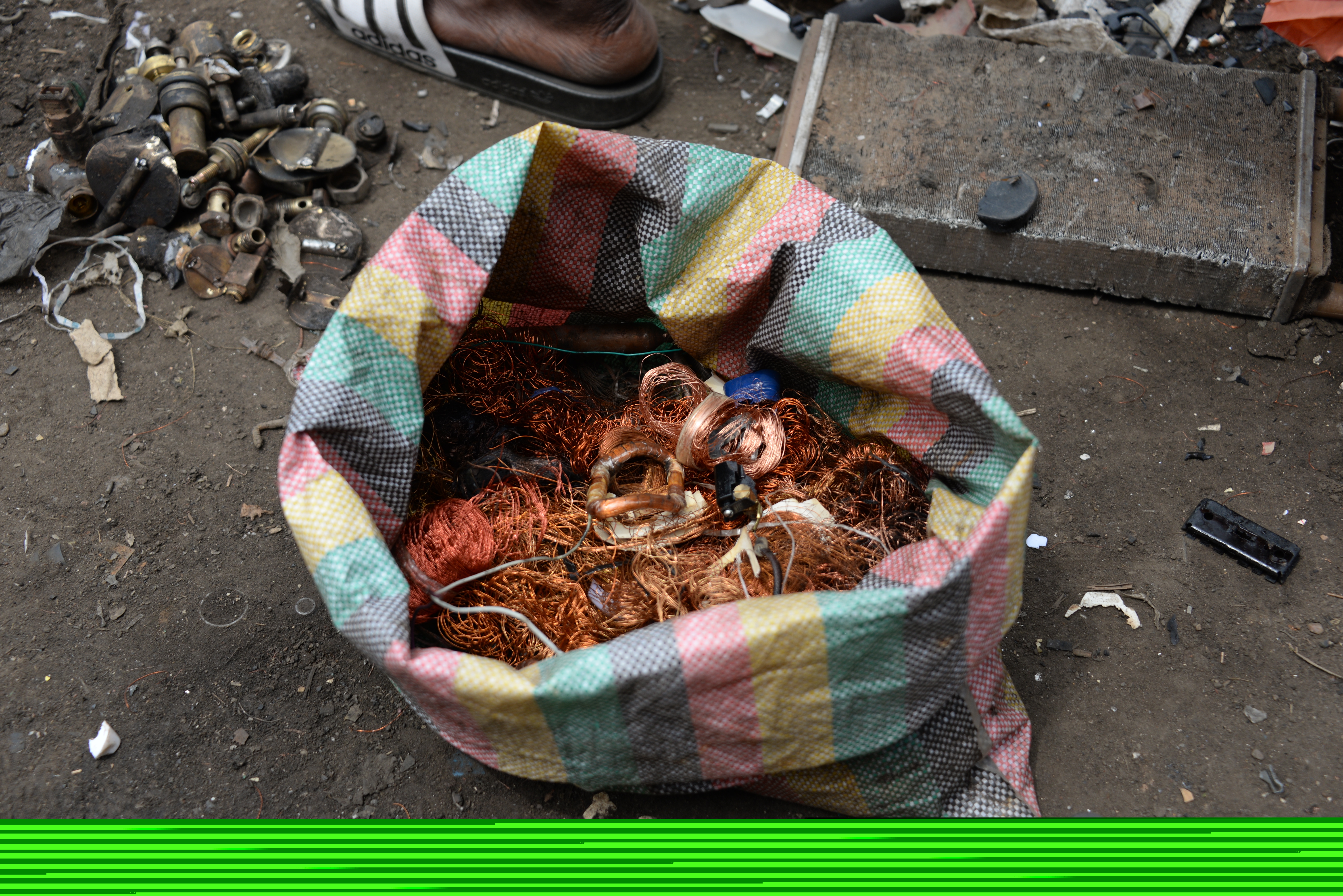 Eine TĂĽte voller Kupferspulen und anderer Metalle liegt vor der Werkstatt des Recyclers Lubman Idris.