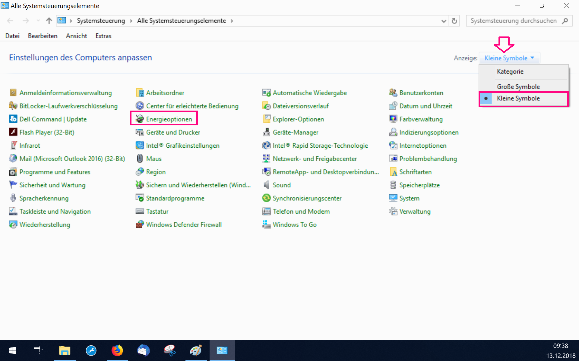 Klicken Sie jetzt auf "Energieoptionen". Wenn diese Schaltfläche Ihnen nicht angezeigt wird, müssen Sie oben rechts neben "Anzeige:" im Dropdown-Menü "Kleine Symbole" auswählen.