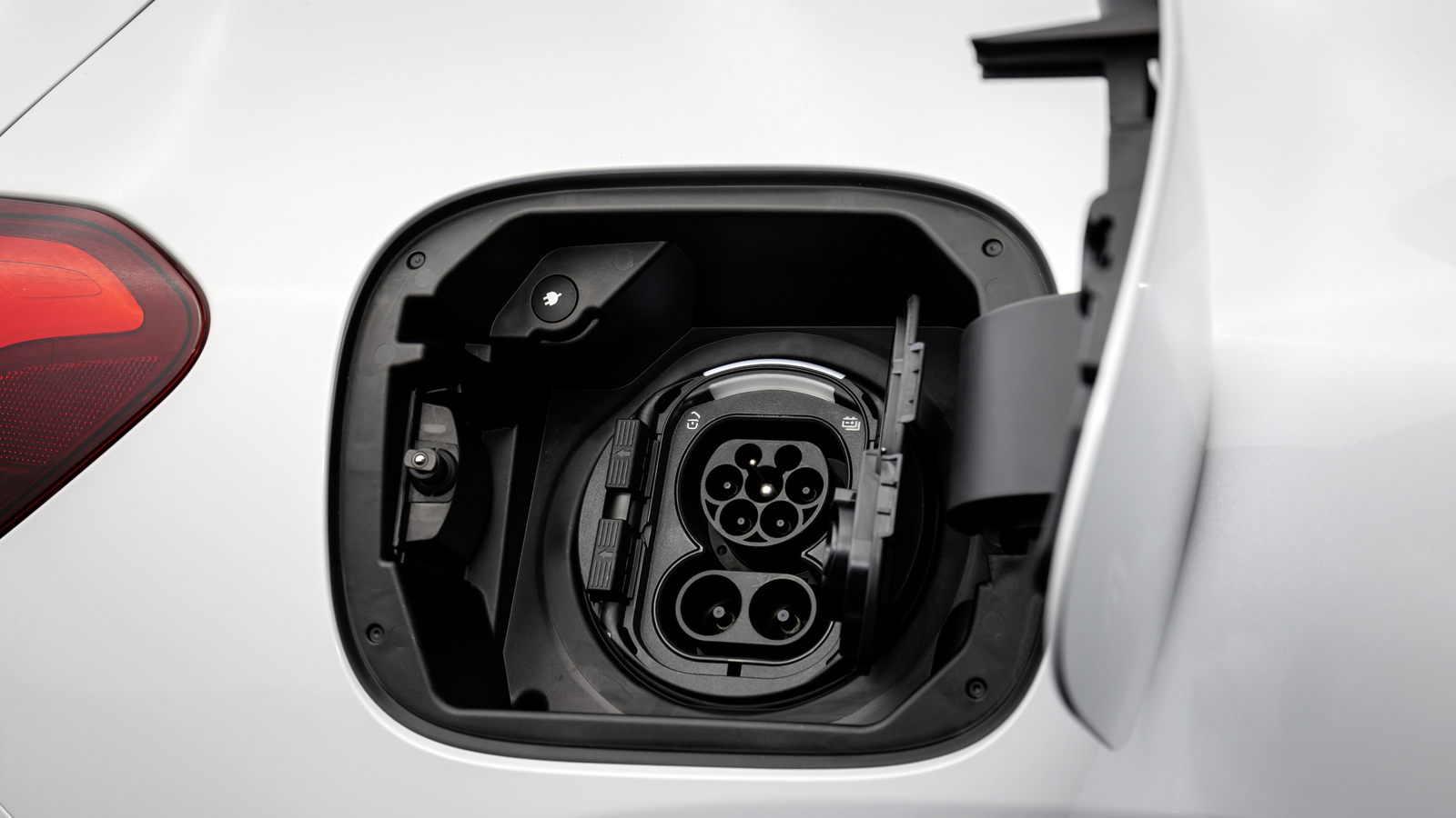 Ladeklappe am Heck mit Klappen statt Stöpseln und sonst allem, was der Kunde wünscht: Ladeanzeige, Schlossanzeige, Beleuchtung und Entriegelknopf, damit man nicht den Keyfob aus der Hosentasche fummeln muss.