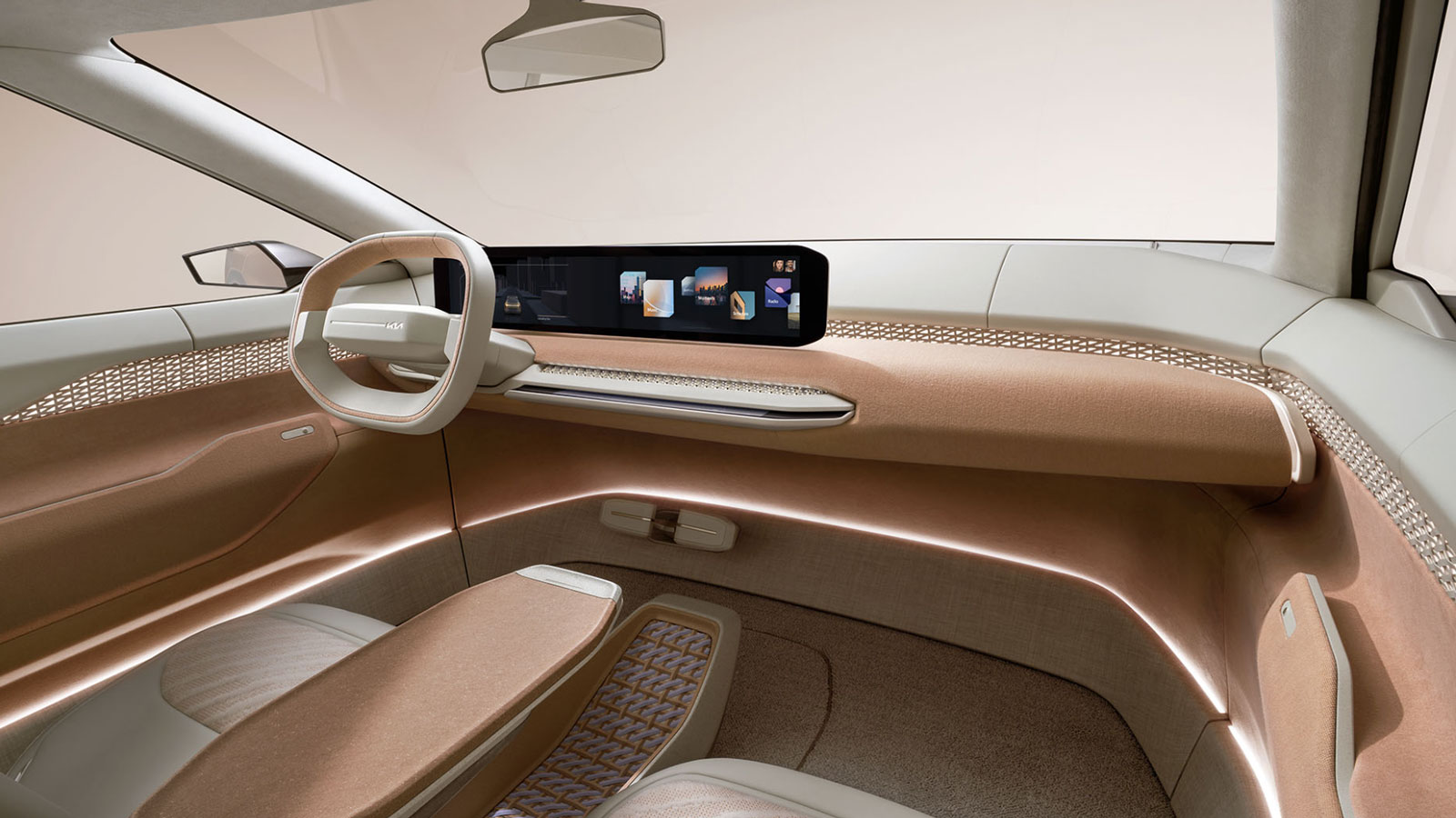 Für den Innenraum gilt wie beim EV3, dass er so nicht in die Serie kommt. Viele Cockpits wirken zurzeit austauschbar: Zwei Screens nebeneinander, möglichst wenig Tasten und Schalter.
