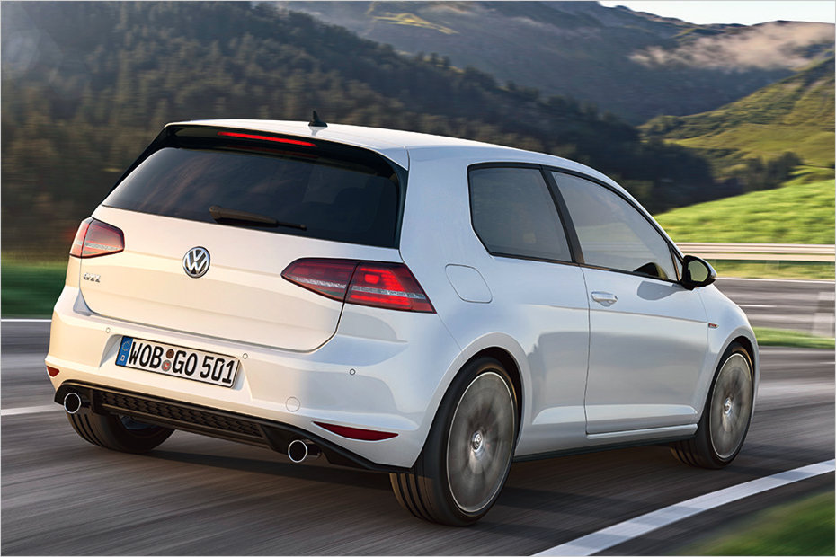 Hinten ist der GTI unter anderem an seinem Dachkantenspoiler und den abgedunkelte LED-RĂĽckleuchten zu erkennen.