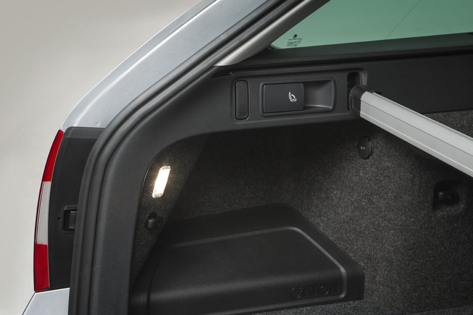 Die RĂĽcklehnen lassen sich mit zwei Schaltern bequem umlegen. Unten sitzt der Subwoofer des Soundsystems von Canton.