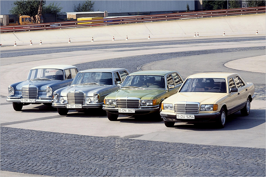 Vier Generationen Luxus auf einem Bild, das anschaulich die Entwicklung des Designs zeigt: W 111 mit Heckflossen, gestraffter W 108, breiter W 116 und schlieĂźlich der W 126 von 1979 (von links).