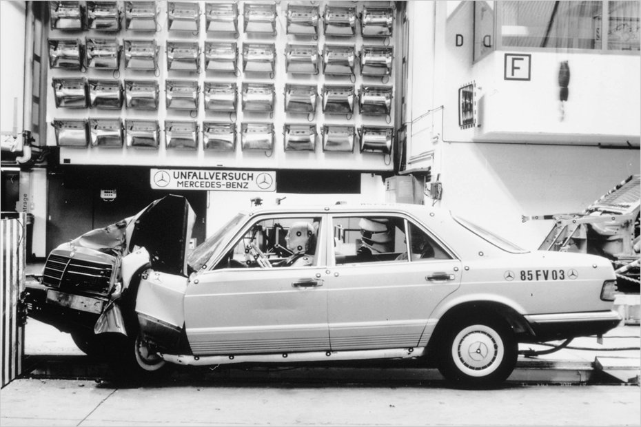 Seit jeher ein wichtiges Thema bei Mercedes: die passive Sicherheit. Im Ernstfall waren Besitzer eines W 126 in ihrem Auto gut geschĂĽtzt.