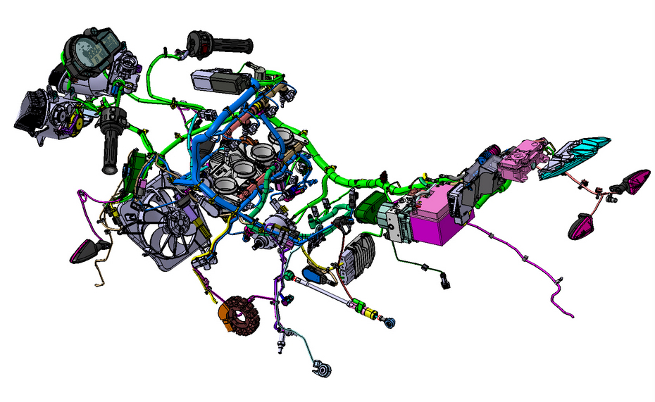 Selbst an vergleichsweise einfachen Motorrädern wird die Elektronik für Laien unüberschaubar. Hier eine CATIA-Rasterung des Kabelbaums der BMW S 1000 RR mit Schräglagensensorcluster (der Kasten hinter der Batterie, vor der Diebstahlwarnanlage im Heck).