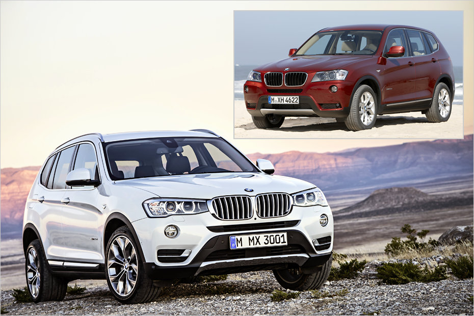 Im direkten Vergleich zum bisherigen X3 (kleines Bild) erkennt man, dass die Scheinwerfer nun bis zum Grill reichen.