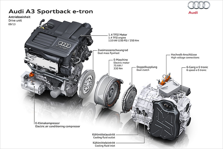 An den Benziner (links) schließen sich die scheibenförmige E-Maschine und das Getriebe an.
