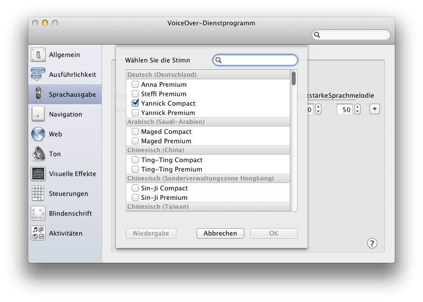 Die Funktion "VoiceOver" zum Vorlesen von Texten und GUI-Elementen kennt unter Lion auch deutsche Stimmen. Das erhöht die Verständlichkeit enorm.