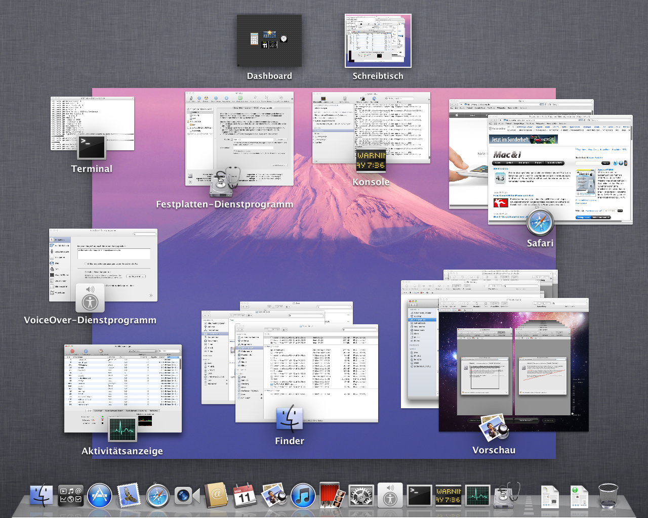 "Mission Control" ist die neue Schaltzentrale der Fensterverwaltung. Die Fenster sind nun gruppiert, was die Übersichtlichkeit erhöht. Die Fenster ausgeblendeter Programme bleiben wie gehabt unsichtbar.