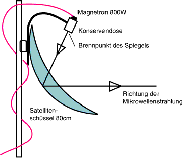 Die Dose wiederum kommt am Offsetspiegel nun an die Stelle des LNB-Feedhorns, mit der Öffnung in Richtung der Schüssel. Die gesamte Konstruktion wird nun nicht auf Astra oder Eutelsat ausgerichtet, sondern auf das bassbebende Fahrzeugheck des auserkorenen Opfers. Denken Sie bei Offset-Spiegeln daran, dass wegen Einfallswinkel=Ausfallswinkel das Magnetron nun oberhalb des nun eher flach liegenden Spiegels zu liegen kommt. Die Wirkrichtung des Antennenspiegels können Sie mit Lineal und Winkelmesser bestimmen.
