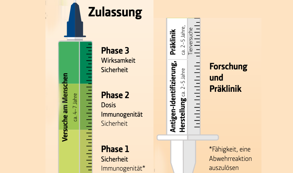 Die Phasen der Impfstoffentwicklung sind normalerweise lang. Forschung und Entwicklung dauern rund 8-17 Jahre, die Entwicklungskosten liegen zwischen 300 und 800 Millionen Euro.