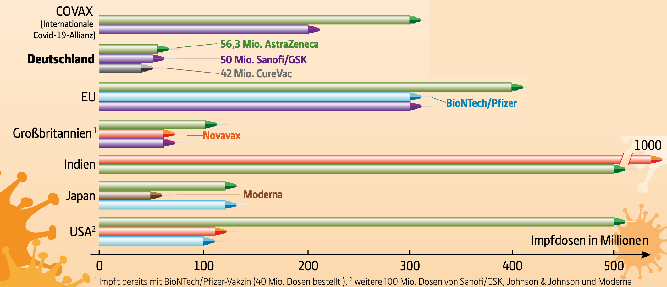 Insgesamt erhält es daraus 250 Millionen Impfdosen. Darüber hinaus hat Deutschland weitere 30 Mio. Dosen von BioNTech/Pfizer, 20 Mio. von CureVac und fünf Mio. von IDT Biologika geordert.