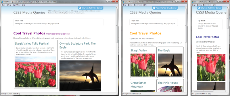 Anders als die erste Preview kann die zweite Vorschauversion mit CSS3 Media Queries umgehen. Hier zieht Microsoft lediglich nach und implementiert eine CSS-Funktion, mit dem aktuelle Versionen der Konkurrenten Firefox, Opera, Safari und Chrome seit einziger Zeit umzugehen wissen. Media Queries beschränken die Einbindung von CSS auf Fälle, die sogenannte "Media Features" bestimmen. Es handelt sich um Ausdrücke, die CSS-Eigenschaften ähneln und die Ausgabe eines Stylesheets oder die Anwendung einer Regel davon abhängig machen, ob das Gerät oder der Browser die Einschränkung erfüllt oder nicht.