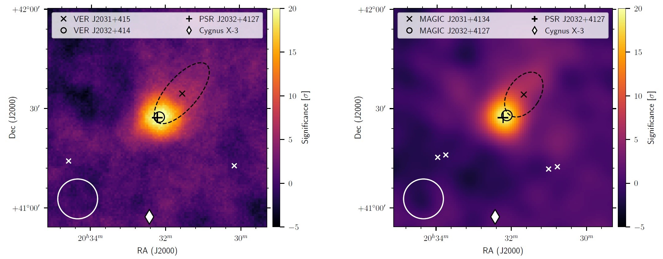 Die Autoren stimmen mit der früheren Analyse der VERITAS-Kollaboration überein, dass der Pulsarwind von PSR J2032+4127 eine plausible Quelle für die Gammastrahlung des Dunklen Beschleunigers TeV J2032+4130 sei.