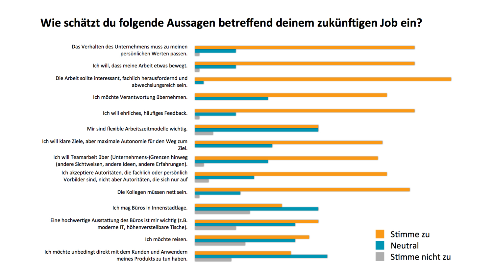 Die Studenten der Mathematik, Informatik, Naturwissenschaften oder Technik (MINT) wünschen sich an erster Stelle Jobs, die interessant, fachlich herausfordernd und abwechslungsreich sind (96,9 Prozent). Damit unterscheiden sie sich nicht von älteren IT-Experten. Im Gegensatz zur Generation der Digital Immigrants (Menschen, die vor 1980 geboren wurden), streben sie jedoch deutlich seltener nach Prestige, Hierarchien und Privilegien.