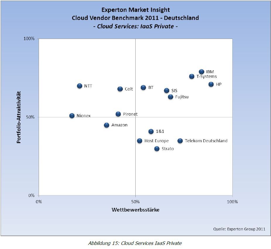 Bei IaaS-Services, die Anwender im eigenen Unternehmen betreiben (Private Cloud) sind laut der Experton-Studie Cloud Vendor Benchmark 2011 neben Anbietern von IT-AusrĂĽstung wie IBM, HP und Fujitsu auch IT-Dienstleister wie T-Systems und SIS in der Spitzengruppe vertreten.