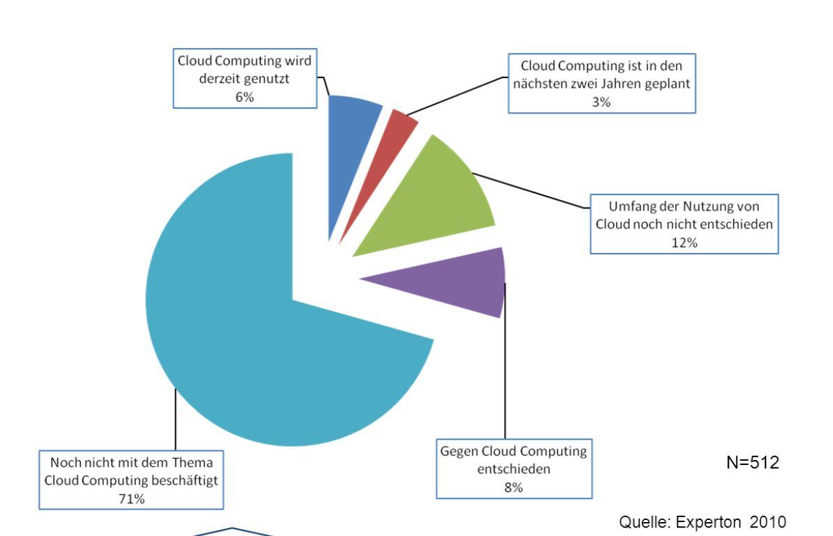 Dennoch scheinen nicht nur Reseller, sondern auch potenzielle Anwender in Deutschland der "Wolke" noch mit einer gewissen Skepsis zu begegnen. So haben sich nach Daten der Marktforschungsgesellschaft Experton Group von 2010 rund 71 Prozent der Unternehmen hierzulande noch nicht mit Cloud-Computing beschäftigt; 8 Prozent lehnen diese Technologie ab. Für Systemhäuser, Value Added Reseller (VAR) und den Fachhandel ist das ein Indikator, dass das Geschäft mit Cloud-Angeboten noch ganz am Anfang steht.