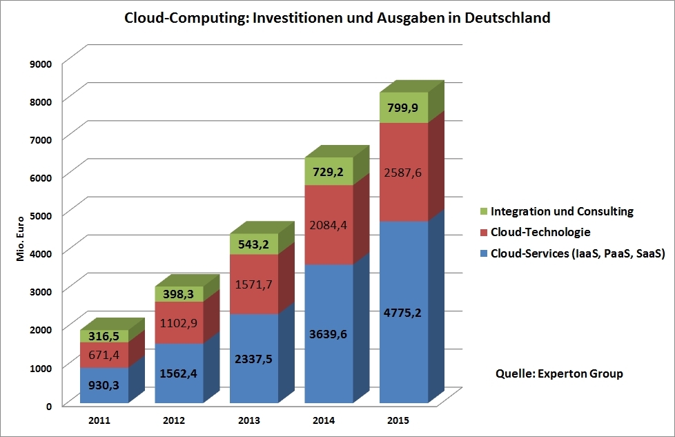 Die Marktforschungsgesellschaft Experton Group erwartet in Deutschland bis 2015 einen Anstieg des Marktvolumens im Bereich Cloud-Computing auf 8 Milliarden Euro.