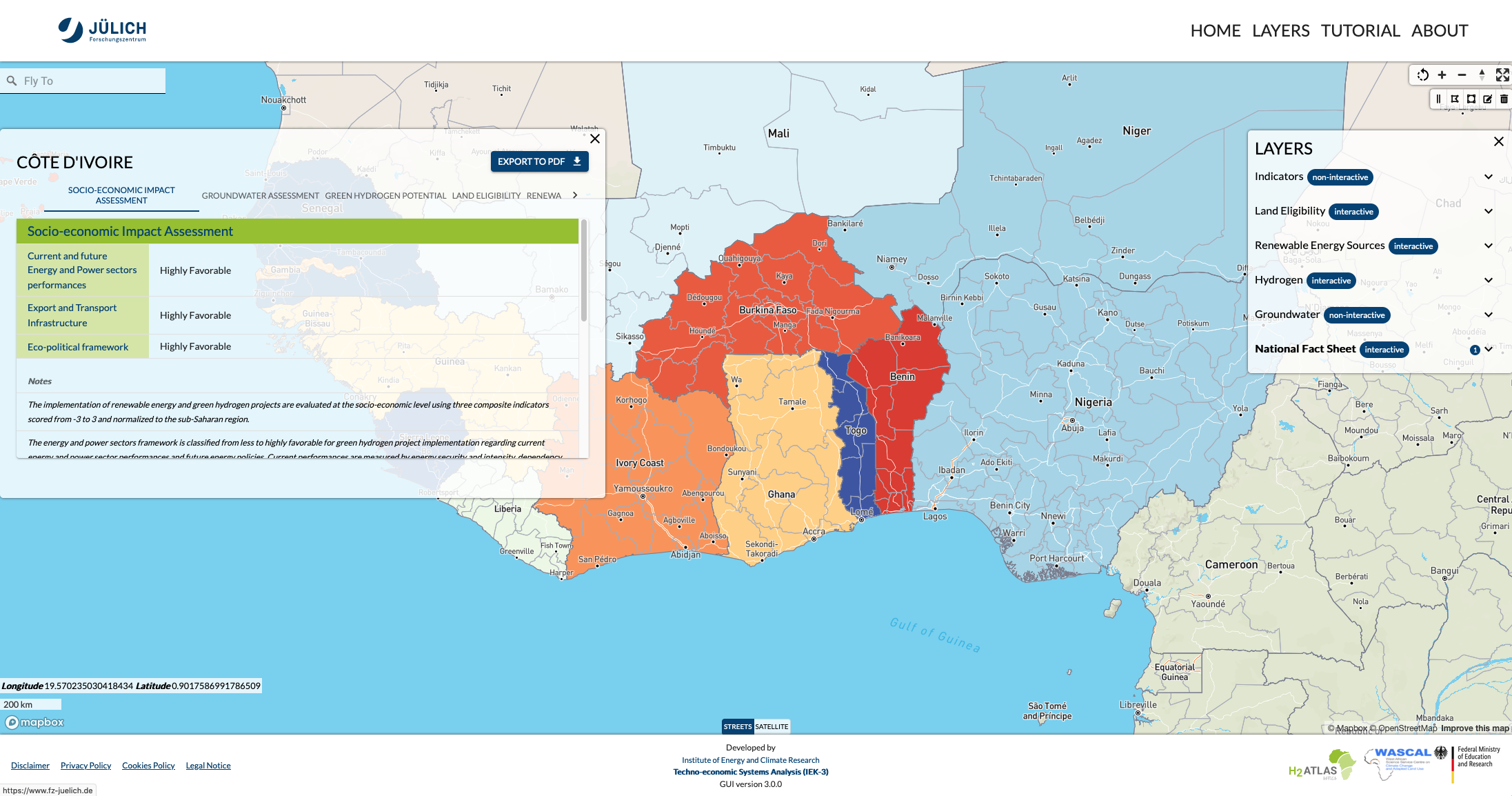 Der H2-Atlas-Afrika entstand im Auftrag des Bundesministeriums Bildung und Forschung am Institut für Energie- und Klimaforschung des Helmholtz-Forschungszentrum Jülich (FZJ). Lokale Daten lieferten Wissenschaftler der beiden deutsch-afrikanischen Kompetenzzentren für Klimawandel und angepasstes Landmanagement im westlichen (WASCAL) und im südlichen Afrika (SASSCAL). Der interaktive Atlas umfasst die 31 Länder der Westafrikanischen Wirtschaftsgemeinschaft (ECOWAS) und der Südafrikanischen Entwicklungsgemeinschaft (SADC).