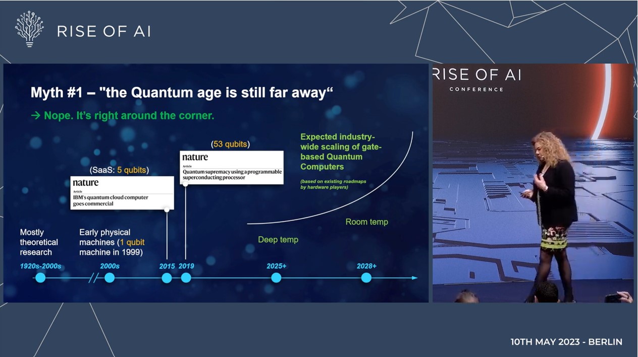 Jeschke went along: It is strange that we indignantly cry "censorship" when China blocks Wikipedia – whereas when Italy blocked ChatGPT, it was no better. "Where is the social outcry against this form of guaranteed fundamental rights in Europe?" asked Jeschke. Presently, there are obviously many myths and half-truths circulating. The myth that the "Quantum Age" is still a long way off persists. "That is wrong – and falls into the category of 'excuses for doing nothing'," Jeschke explained. She emphasized the core thesis of her talk: "For such a disruptive technology, there is not a long time for extensive preparation!"