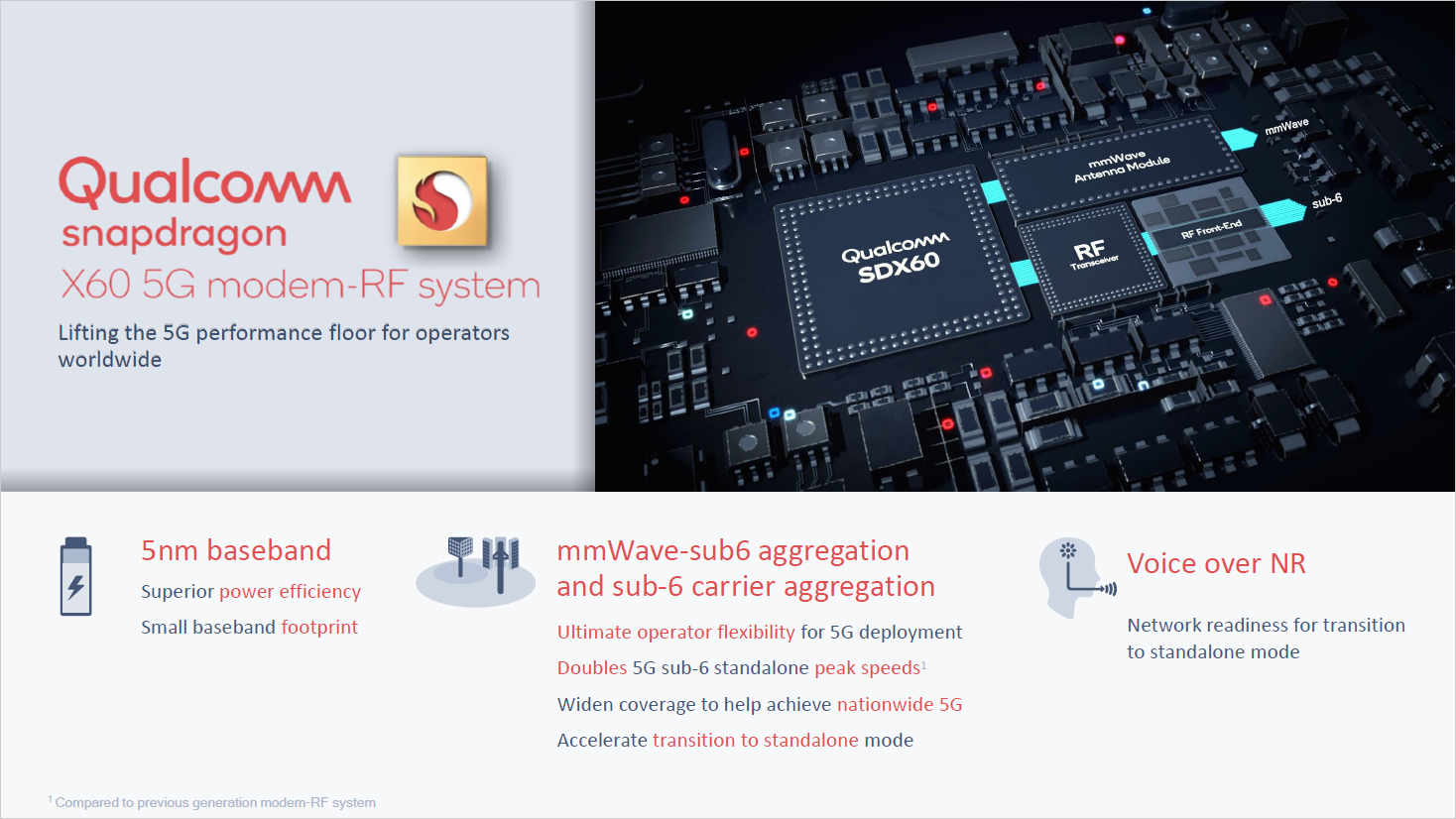 Das Mobilfunkmodem Snapdragon X60 unterstützt erstmals alle vorgesehenen Frequenzbänder für 5G-Mobilfunk sowie Telefonie über 5G.