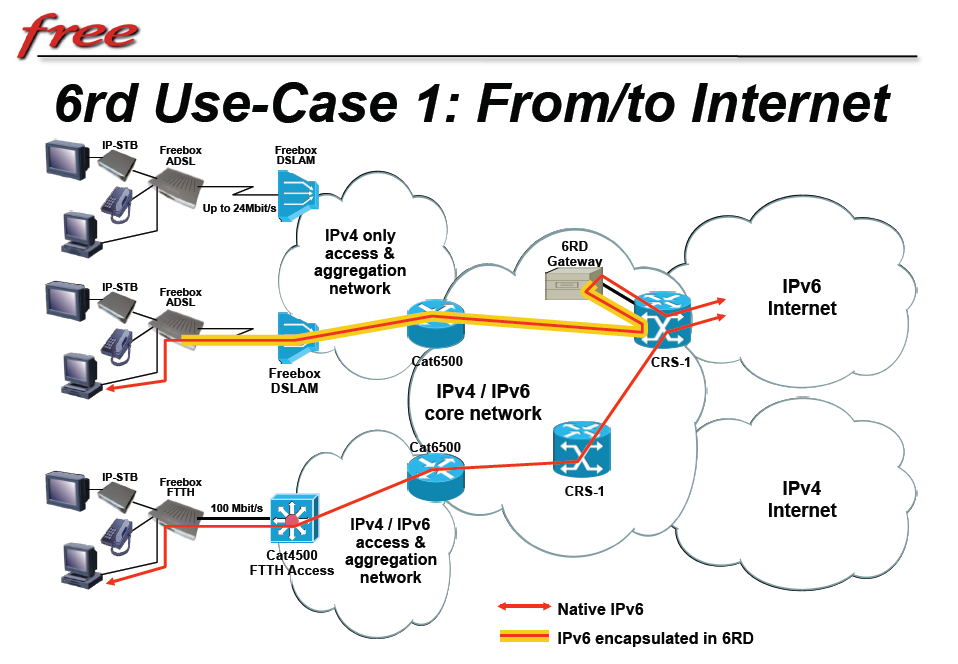 6RD verpackt in dem ADSL-Gateway wie ein 6to4-Tunnel IPv6-Daten in IPv4-Pakete, doch nutzt die Technik global-gültige Unicast-IPv6-Präfixe und nicht feste Adresspräfixe wie bei 6to4 (2002::/16 gemäß RFC 3056). 6RD-Adressen setzen sich stattdessen aus einem vom RIPE zugeordneten Präfix wie 2a01:0e00:::/26, zwei für interne Zwecke reservierte Bits, der aktuellen IPv4-Adresse des Endkunden-Geräts (32 Bit) und einer Subnet-ID (4 Bit) zusammen. Die Anfragen ins IPv6-Internet laufen dabei über 6RD-Gateways, während 6RD-Knoten direkt per Tunnel miteinander kommunizieren. Despres und Free haben 6RD nun auch bei der Internet Engineering Task Force als Standarddokument auf den Weg gebracht.