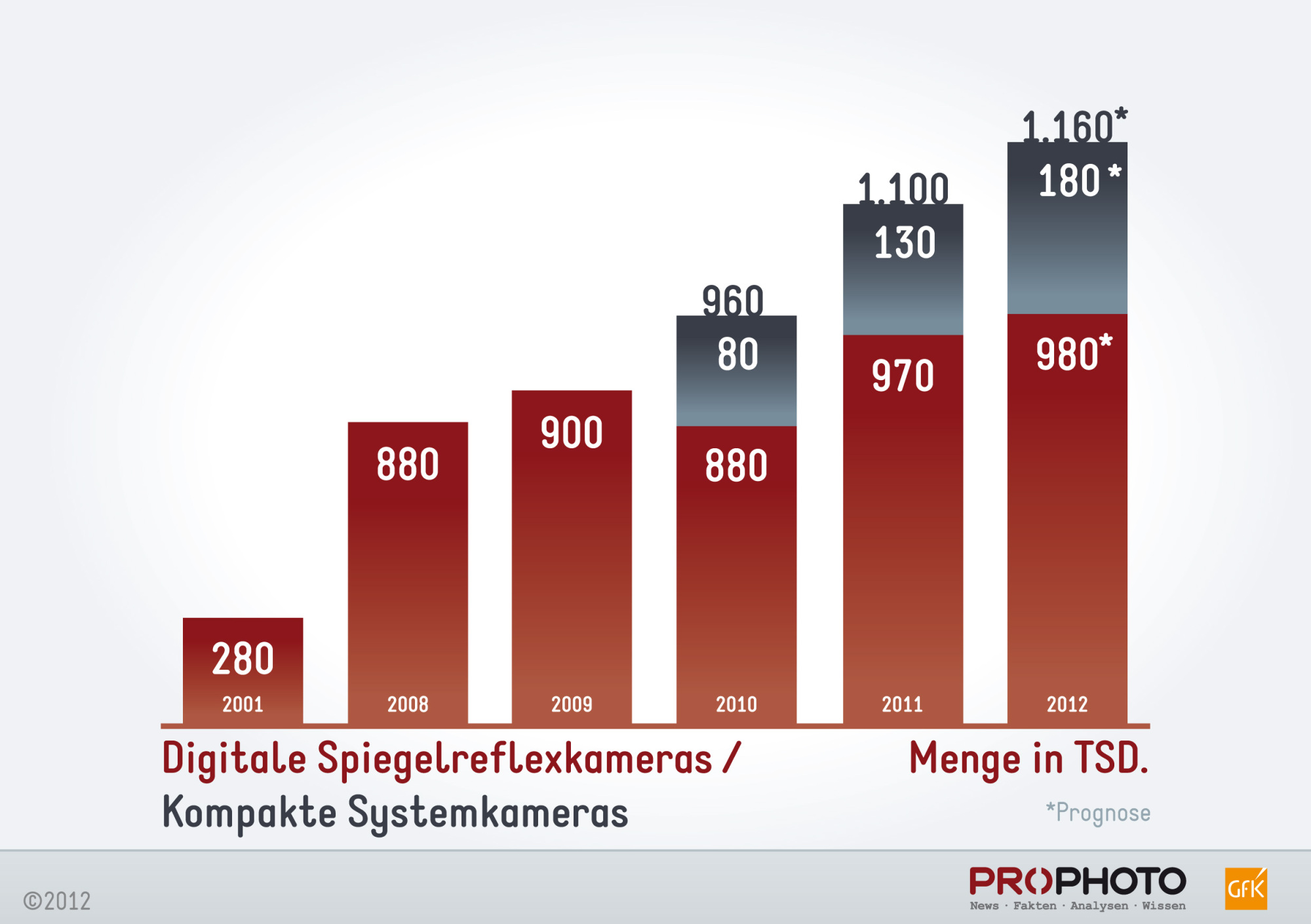 GfK und Photoindustrie-Verband prognostizieren für die Kameras mit Wechseloptik allerdings eine stete Erhöhung der Durchschnittspreise. In den vergangenen zwölf Monaten kletterte der Preis für eine Spiegelreflexkamera von 633 Euro auf etwa 700 Euro und für eine spiegellose Systemkamera von 470 Euro auf 530 Euro. Die Wertschöpfung mit diesen Kameras lag in 2011 bei 674 Millionen Euro und soll in 2012 auf 720 Millionen Euro steigen.
