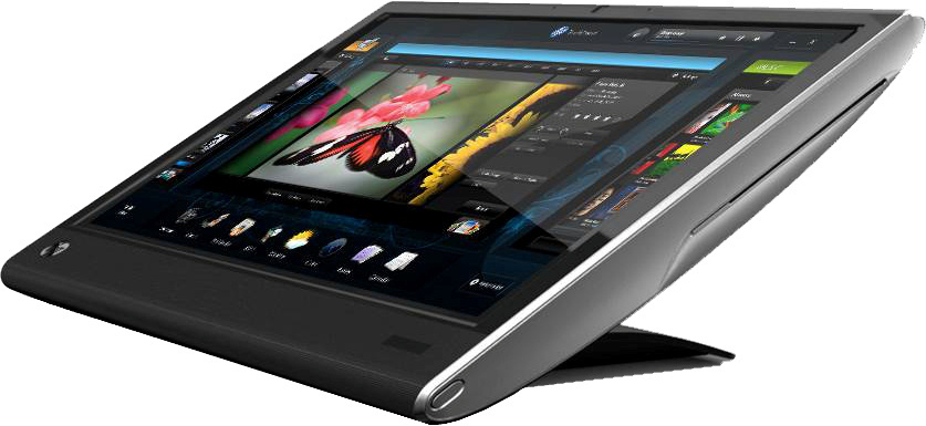 All-in-One-PCs gibt es bereits seit längerem auch mit Multitouch-Displays, die die Bedienung mit zwei Fingern gleichzeitig erlauben. Bislang ließen sich die im Monitorgehäuse untergebrachten Rechner jedoch nur um wenige Grad nach hinten kippen, wodurch die Arme nach kurzer Zeit ermüden. Der Touchsmart 610 von Hewlett-Packard erlaubt eine ergonomischere Handhaltung, weil sich der 23-Zoll-Touchscreen (1920 ×1080 Pixel) auf einen Winkel von 30 Grad herabschwenken lässt.