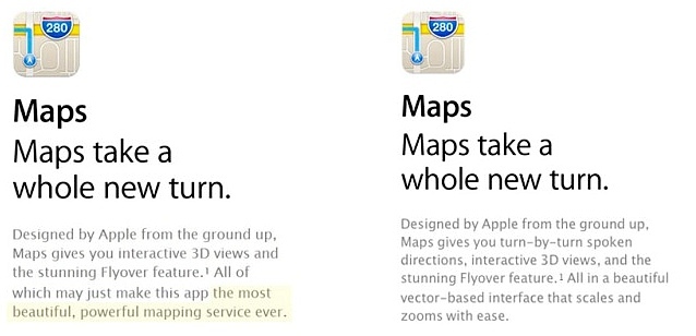 Apple hat auf seiner Homepage eine vollmundige Werbeaussage zu seinem problematischen neuen iOS-6-Kartendienst zurückgenommen. Statt die Maps-App als "schönsten und mächtigsten Kartendienst aller Zeiten" ("the most beautiful powerful mapping service ever") zu bezeichnen, heißt es von dem Unternehmen nun nur noch, die Anwendung habe "ein schönes vektorbasiertes Interface, das sich leicht skalieren und zoomen lässt" . Zudem ergänzte Apple einen Hinweis auf die sprachgestützte Turn-by-Turn-Navigation. Auf der deutschen Apple-Homepage heißt es dagegen nach der Aufzählung der verschiedenen neuen Funktionen: "All das macht die App zu einem der leistungsstärksten und im wahrsten Sinne sehenswertesten Navigations- und Kartendienste."
