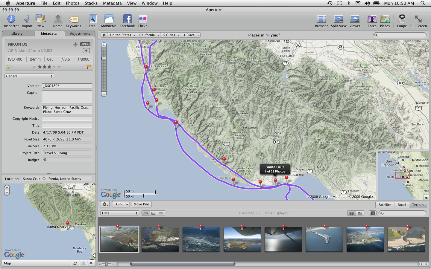 Über den Bereich "Orte" in der Bibliothek kann man Fotos anhand des Aufnahmeorts suchen. Wie iPhoto wandelt laut Apple auch Aperture 3 die in Fotos gespeicherten Geodaten in Ortsnamen um. Außerdem übernimmt die Anwendung Positionsangaben vom iPhone und aus den Daten eines GPS-fähigen Geräts. Zieht man ein Foto mit der Maus auf die via Google eingebundene Landkarte, übernimmt Aperture die Geodaten als Aufnahmeort des Fotos.