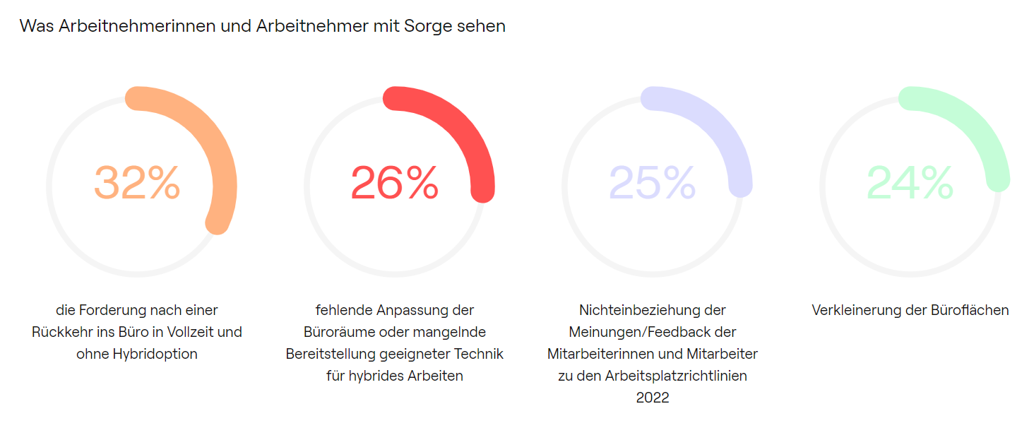 44 Prozent der Befragten waren sich aber auch sicher, dass die Arbeitskräfte bevorteilt werden, die im Büro arbeiten – sie also mehr Mitspracherecht und Chancen auf Entwicklungsmöglichkeiten haben. Die Hälfte der Befragten gab außerdem an, dass sie eher mit anwesenden Personen ins Gespräch kommt und eher diese nach ihrer Meinung gefragt werden. Trotzdem zeigten sich 74 Prozent der Befragten besorgt, dass ihr Unternehmen Arbeitsplätze, Richtlinien oder Anforderungen nicht an die (neue) Hybridarbeit anpasst.
