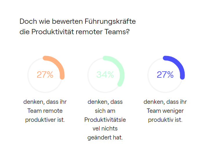 Als produktiver (27 Prozent) oder gleichwertig produktiv (34 Prozent) empfanden der Großteil der Führungskräfte die Remote-Teams, 27 Prozent denken, dass ihr Remote-Team weniger produktiv ist.