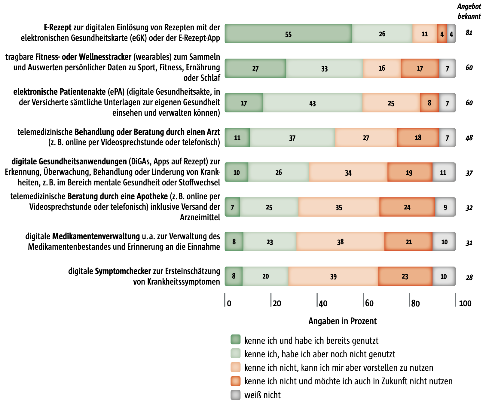 Auch digitale Anwendungen werden zunehmend erwartet. Zwar ist das E-Rezept angekommen, doch nur 17 Prozent nutzen derzeit die elektronische Patientenakte, 8 Prozent wollen sie auch in Zukunft nicht nutzen. Digitale Gesundheitsanwendungen oder Symptomchecker werden bislang kaum eingesetzt – jeweils rund 10 Prozent der Befragten haben diese Angebote genutzt. Telemedizinische Angebote wie Videosprechstunden sind immerhin 58 Prozent der Versicherten bekannt, aber nur 14 Prozent haben sie bisher tatsächlich genutzt.