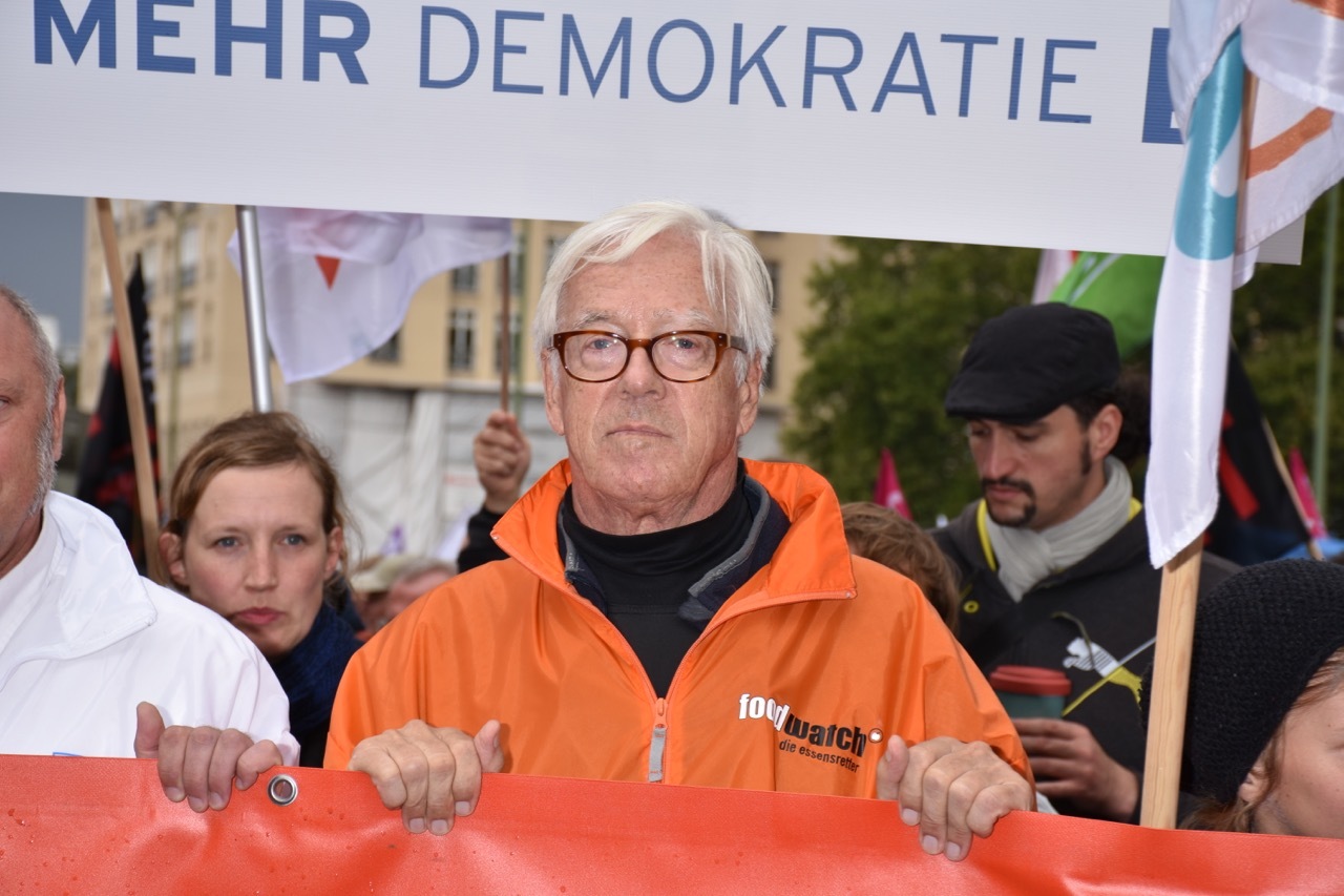 Michael Müller, der Bundesvorsitzende der Naturfreunde Deutschlands, machte in der Hauptstadt in den geplanten Übereinkünften "Relikte einer längst niedergehenden Epoche" sowie einen "Angriff auf die Demokratie und erkämpfte Rechte" aus. Ceta sei so problematisch, weil es Vorbild für die Globalisierung sein solle. "Seit mehr als 25 Jahren fordern wir eine Welt der Nachhaltigkeit, doch die Politik hängt immer mehr Konzepten von vorgestern an", hielt Müller dem entgegen. "Wir wollen die Globalisierung gestalten, wir sind keine Nein-Sager", meinte er und grenzte sich wie mehrere andere Redner auch gegenüber der AfD und anderen Rechtsbewegungen ab: "Wir haben mit Frauke Petry oder Marine Le Pen nichts am Hut." Diese sollten "in der kleinen Opposition bleiben".