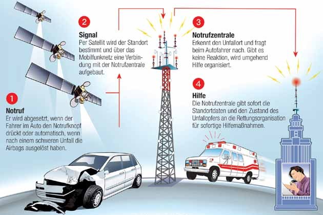 Nach dem Willen der Europäischen Kommission sollen vom Jahr 2015 an alle neuen Pkw und leichte Nutzfahrzeuge mit einer automatischen Notruffunktion ausgerüstet werden. Das eCall getaufte System soll nach einem schweren Unfall selbsttätig die Notrufnummer 112 anwählen und Daten über den Standort des Fahrzeugs an die Notrufzentrale übermitteln. Dies soll die Chancen auf Rettung zum Beispiel für bewusstlose Insassen erhöhen. Um einen Notruf auszulösen, nutzt eCall die Daten der Fahrzeugelektronik – zum Beispiel, wenn die Airbags auslösen.