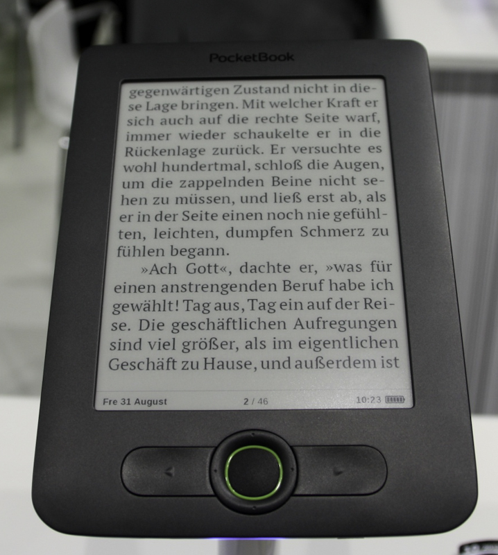 Technische Raffinessen darf man bei den Einstiegsgeräten nicht erwarten: Beide haben ein 6-Zoll-Display mit 800 × 600 Bildpunkten. Das Pocketbook Basic New setzt dabei auf die ältere E-Ink-Generation Vizplex, die etwas kontrastärmer als die aktuelle Generation Pearl (zum Beispiel im aktuellen Kindle und Sony Reader) daherkommt. In den Datenblättern vom Pyrus Wifi steht wage "Digital Ink Display" – laut einer Mitarbeiterin am Trekstor-Stand auf der IFA soll es sich dabei um E-Ink Pearl handeln, eine Mitarbeiterin der Pressestelle verneinte dies allerdings inzwischen auf Anfrage von heise online und sagte, es handle sich nicht um ein Display von E-Ink. Das entspricht auch unserem Eindruck von der Kontrasthöhe beim ersten Ausprobieren, die nicht so hoch wie bei Kindle oder Sony Reader erschien. Bedient werden die Reader über Buttons unterhalb und seitlich des Displays, Touchscreens haben sie nicht.