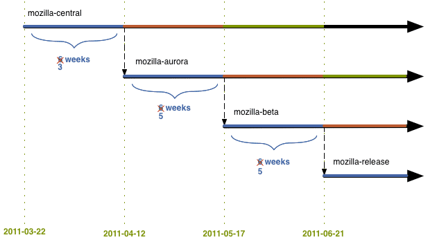 Die nächste Version des Mozilla-Web-Browsers Firefox wird voraussichtlich am 21. Juni erscheinen. Das geht aus einem Plan hervor, der auf der Softwareentwicklungs-Hosting-Plattform Github veröffentlicht wurde. Demnach soll schon kommende Woche für Firefox 5 eine neue sogenannte Aurora-Phase beginnen, die nach fünf Wochen von der Beta-Phase abgelöst werden soll. Parallel zur Aurora-Phase für Firefox 5 soll am 12. April der Entwicklungszyklus für Firefox 6 beginnen. Für gewöhnlich sollen die Phasen sechs Wochen dauern; wegen Überschneidungen bei der Entwicklung von Firefox 4 sollen sie bei Firefox 5 kürzer sein.