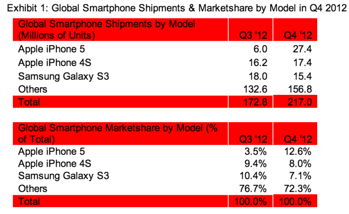 Demnach wurde das iPhone 5 in einer Stückzahl von 27,4 Millionen verkauft, das iPhone 4S insgesamt 17,4 Millionen Mal. Das Galaxy S3 landete mit 15,4 Millionen verkauften Einheiten nur noch auf Rang drei. Im 3. Quartal 2012 hatte Samsung mit 18 Millionen Einheiten laut Strategy Analytics Apple sowohl bei dem damals gerade auf den Markt gekommenen iPhone 5 (6 Millionen Einheiten) als auch beim iPhone 4S (16,2 Millionen Einheiten) abgehängt.