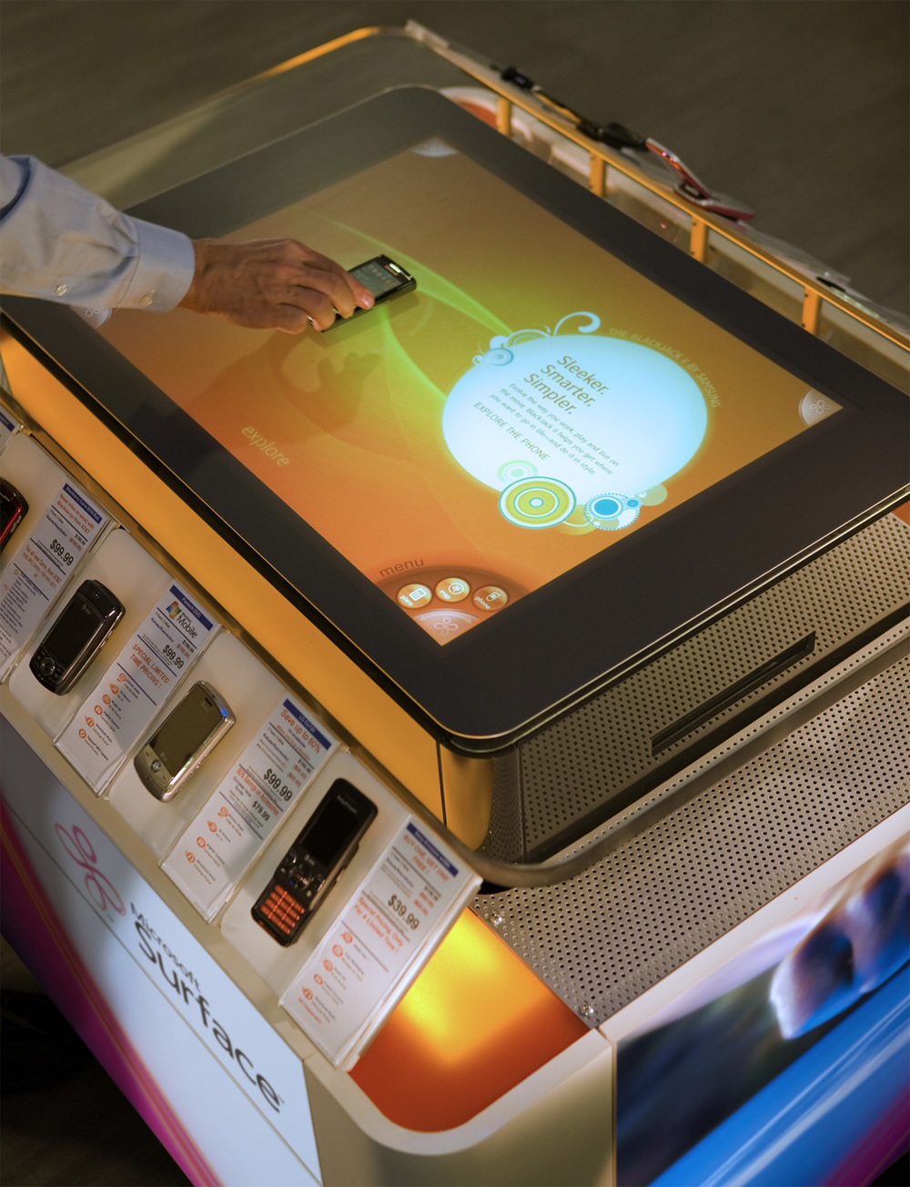 Für AT&T-Kunden ist geplant, dass sie ihr Mobiltelefon auf einen Surface legen und es via Drag & Drop mit Klingeltönen, Videos und anderen Inhalten befüllen können. Zudem sollen sie sich über einen interaktiven Stadtplan über die Umgebung orientieren können. Microsoft und AT&T wollen weitere Möglichkeiten für die Verwendung des Displaytisches ausloten. Berührungsempfindliche Displays stellte AT&T 1993 in einem Werbespot über seine Visionen dar, dessen Ambiente teilweise an den Kinofilm Blade Runner erinnert.