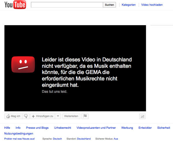 Leider ist dieses Video in Deutschland nicht verfügbar, da es Musik enthalten könnte, für die die GEMA die erforderlichen Musikrechte nicht eingeräumt hat. Das tut uns leid. – Diesen Satz kennt jeder deutsche YouTube-Nutzer. Nicht selten landet man in dieser Rechte-Sackgasse, wenn man einem Link folgt, das Nutzer in den USA, Großbritannien oder anderswo zu einem Musikvideo führt.