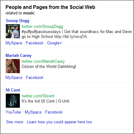 Entwickler von Facebook, Twitter und MySpace haben jetzt eine kleine Browser-Erweiterung namens Focus on the User vorgestellt, mit der sie zeigen wollen, dass Google auch wesentlich ausgewogenere Treffer präsentieren könnte. Focus on the User ist ein Bookmarklet, also eine kleine, in ein Bookmark verpackte JavaScript-Datei, die laut FAQ in Chrome, Firefox und Safari funktioniert, im Internet Explorer aber nicht. Man zieht den Link in die Browser-Werkzeugleiste, von wo aus man ihn immer aufrufen kann. Startet man eine Google-Suche auf der amerikanischen Suchseite, zum Beispiel nach music, dann präsentierte Google in unseren Versuchen unter "People and Pages from the Social Web" die Google+-Seiten von Snoop Dogg, Mariah Carey und 50 Cent. Startete man das Bookmarklet, blieben zwar die Künstler bestehen. Die Links wurden durch welche auf Twitter, Facebook und MySpace ersetzt. Nur bei Snoop Dogg blieb auch der Link zu Google+ erhalten.