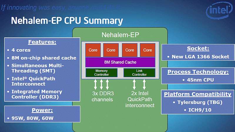 Die SAP-SD-Veröffentlichungen bestätigen auch eine Reihe von Spekulationen, etwa die Typenbezeichungen der kommenden Xeons, von denen Intel bisher nur den Codenamen Nehalem-EP verraten hatte. Hewlett-Packard (HP) will die neuen Prozessoren in einen Server namens ProLiant DL380 G6 einbauen, das Gerät von Fujitsu Siemens Computers (FSC) soll Primergy TX300 S5 heißen. Die erwähnten, aktuellen Quad-Core-Xeons aus dem Benchmark stecken bei HP in einem ProLiant DL380 G5; beide Benchmark-Läufe von HP fanden mit SAP ERP 6.0 statt, als Betriebssystem kam jeweils Windows Server 2003 und als Datenbank SQL Server 2005 zum Einsatz. Während im ProLiant DL380 G5 32 GByte Hauptspeicher steckten, waren es beim DL380 G6 48 GByte; die kommenden Nehalem-EP-Server werden statt vier Fully-Buffered-DIMM-Speicherkanälen sechs Kanäle für Registered-DDR3-DIMMs anbinden, nämlich jeweils zwei pro CPU; die Prozessoren kommunizieren dabei via QPI.