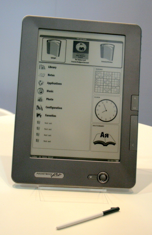 Pocketbook (Halle 14.1, Stand 109) zeigt auf der IFA neue E-Book-Reader und ein Tablet-Mockup. Die Premium-Reader Pro 603 und Pro 903 sind mit resistivem Touchscreen, Stylus, WLAN (802.11 b/g), Bluetooth und UMTS-Modul ausgestattet. Das Pro 603 mit 6 Zoll Displaydiagonale und 800 × 600 Bildpunkten entspricht klassischen E-Book-Readern wie dem Sony Reader und dem Kindle, der Pro 903 soll sich mit 9,7 Zoll Displaydiagonale und einer Auflösung von 1200 × 825 Bildpunkten auch zur Anzeige von DIN-A4-PDFs und Magazinen eignen. Beide Reader gibt es auch in einer etwas schwächeren Ausstattung als Pro 902 und Pro 602 ohne Touchscreen und UMTS.