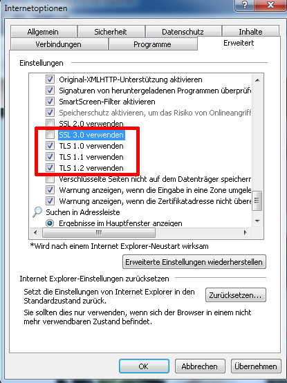 Man kann das allerdings auch ganz einfach von Hand erledigen – und das hat durchaus seine Vorzüge. Denn das kleine Fix-it-Progrämmchen schalteten bei unseren Tests nicht nur das kaputte SSLv3 sondern auch die durchaus erwünschten, aktuellen Standards TLS 1.1 und vor allem TLS 1.2 ab. Die Änderung ist ganz einfach: Unter "Extras/Internetoptionen/Erweitert" findet man eine Liste mit Optionen. relativ weit unten kann man dort SSLv3 ab- und dann auch gleich TLS 1.1 und 1.2 einschalten.