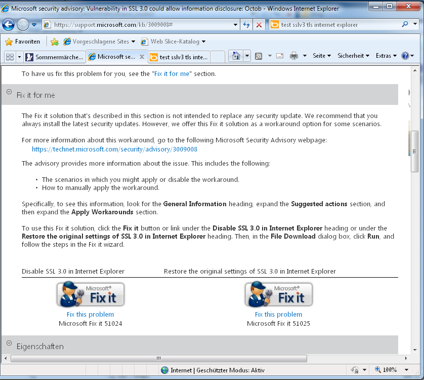 Mit einem von Microsoft bereit gestellten "Fix it" kann man den kaputten Verschlüsselungsstandard SSLv3 im Internet Explorer einfach abschalten. Doch die Schnellhilfe hat ihre Tücken.